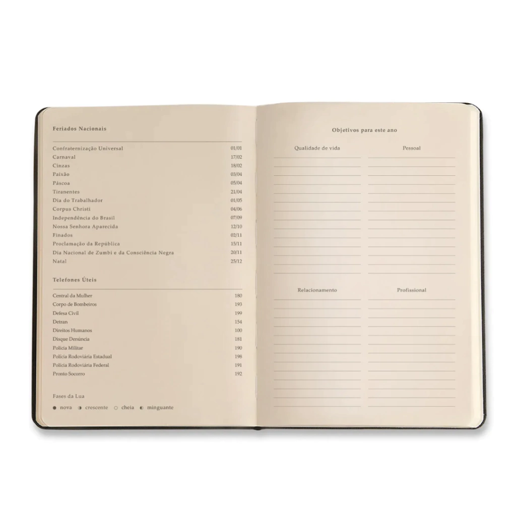 Com miolo de 160 páginas em Papel Pólen® Natural 80 g/m², reúne recursos completos: calendário funcional para datas importantes, lista de objetivos, planejamento anual e financeiro, visão mensal com calendários complementares e páginas para anotações.