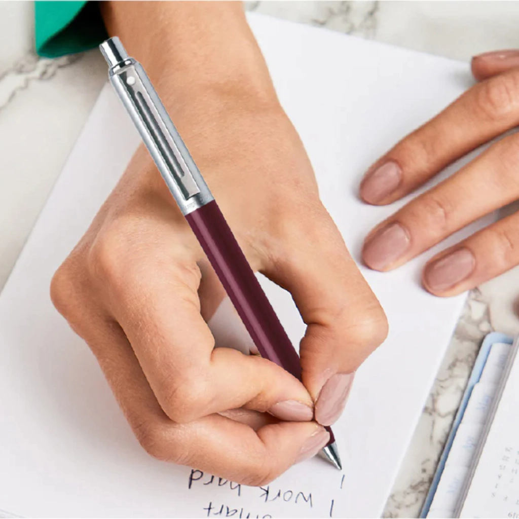 A Sheaffer® Sentinel é a combinação perfeita entre estilo clássico e praticidade moderna. Com um design retrô inspirado nas décadas passadas, esta caneta esferográfica oferece uma escrita confiável para o dia a dia com seu mecanismo de clique tradicional. O modelo em destaque traz um corpo Burgundy (vinho) com detalhes cromados, proporcionando um visual elegante e atemporal.