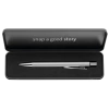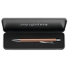 Enquanto o botão de pressão, o clipe e a ponta possuem acabamento cromado brilhante, o corpo de alumínio recebe um revestimento perolado. Isso confere à caneta seu brilho metálico sofisticado, disponível nas cores prata, platina, dourado, ouro rosé, cobre e azul gelo.