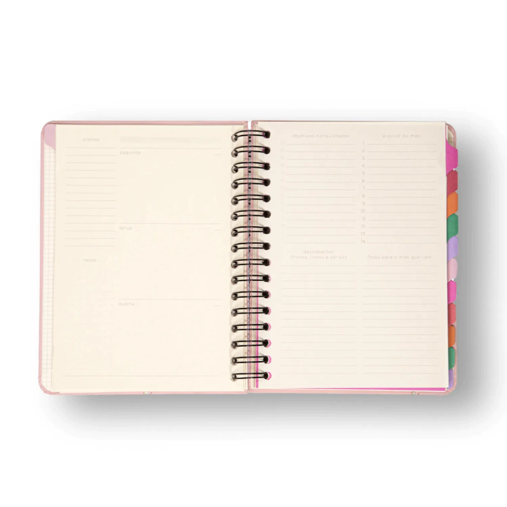 Tamanho compacto e funcional: A5 (14,8x21cm) fácil de transportar sem abrir mão do espaço interno para anotações e planejamentos.