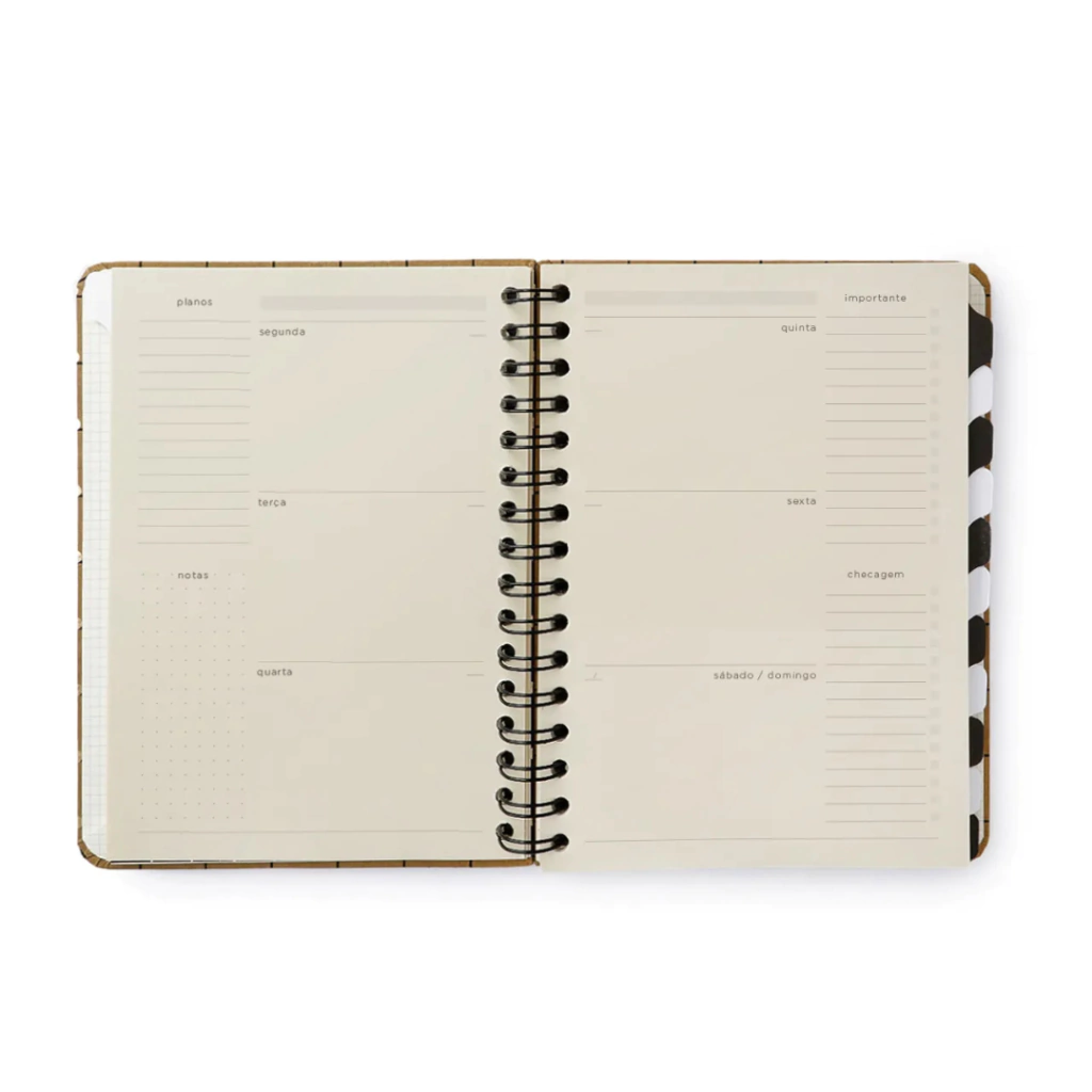 Tamanho compacto e funcional: A5 (14,8x21cm) fácil de transportar sem abrir mão do espaço interno para anotações e planejamentos.