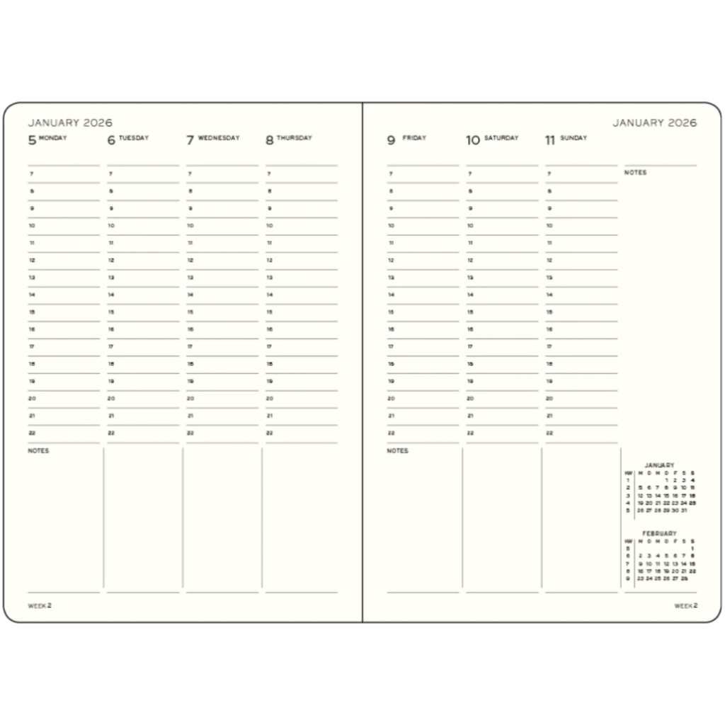 Uma visão completa da semana é apresentada em página dupla, com cada dia tendo uma seção com espaço suficiente para anotações.